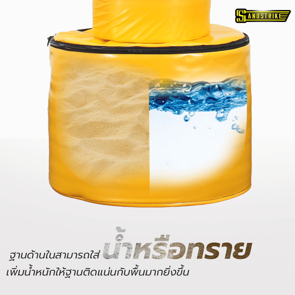 กระสอบทรายตั้งพื้น SMASHER BS-500 ผลิตจากโฟมอัดแน่น 4 ชั้น หุ้มหนัง PU ขนาด 30*175*55 ซม. มีที่หุ้มแกน ขนาด 30 ซม. หนา 2.5 ซม. ตัวดูดสูญญากาศ 12 ตัวที่ฐาน ฐานสามารถใส่น้ำหรือทรายเพื่อเพิ่มน้ำหนักได้